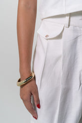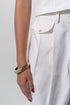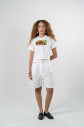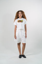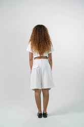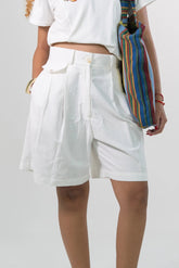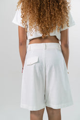 Bermuda en Silueta A en Algodón, ajustado en cintura y relajada en cadera. Pretina con pasadores, sistema de cierre con cremallera y botón. Va con Prenses asentados en delantero, bolsillos de costado y bolsillo de ribete en el posterior.