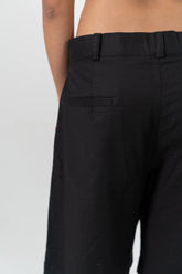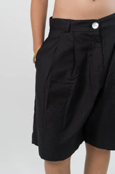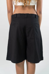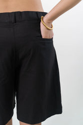 Bermuda en Aldogón Silueta A, ajustado en cintura y relajada en cadera. Largo antes de rodilla. Pretina con pasadores, sistema de cierre con cremallera y botón de nácar. Va con Prenses asentados en delantero, bolsillos de costado y bolsillo de ribete en el posterior.