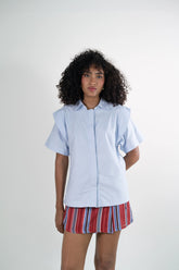 Camisa silueta relax en Algodón con cuello camisero, botonera doble, botones de nácar y corte adicional en siza, que simula hombrera. En el trasero lleva almilla y tabla externa.