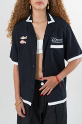 Camisa Silueta Unisex en algodón, con cuello resort, botonera sencilla, bolsillo delantero. Bordados en el delantero, de dos pescados, "El Pescado, FRESH & HEALTHY" "A&S". Va con sesgo en Cuello, en ruedo, y manga.