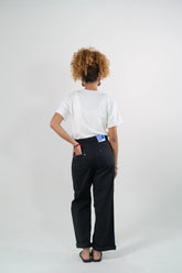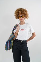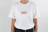 T-shirt de Silueta ajustada Talle Largo, con cortes en el delantero. Cuello redondo, manga corta con ruedo tipo guardapolvo. Estampado en serigrafia ”made in cartagena ” .