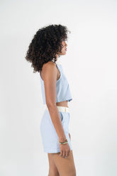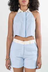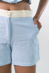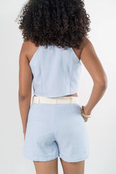 Short tiro alto en algodón con sistema de cremallera y botón. Pretina con pasadores. Silueta pierna recta con bolsillos de costado.