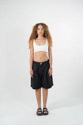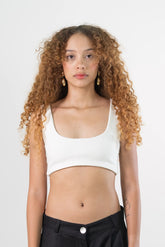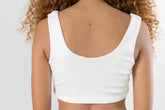 Top ajustado en Rib de doble escote, uno profundo ( trasero ) y otro mas cubierto (delantero ). Silueta ajustada, largo crop top.